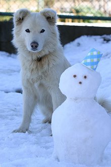 ![]() 大晦日の午後から降った雪が日陰に残ってたので、テラの記念写真を。雪だるまの目と鼻はドッグフード(スマック)の粒。 (2005/01) |